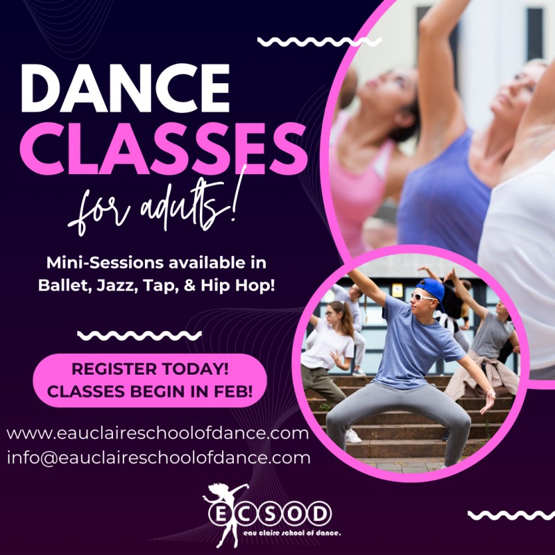 Eau Claire School of Dance is thrilled to offer a variety of Beginner/Intermediate level dance classes for students ages 18 and up! Though designed for fun and exercise, our adult dancers will also have the opportunity to perform in our spring recital if they wish to. Contact ECSOD for more information on our Adult Classes, or register now!