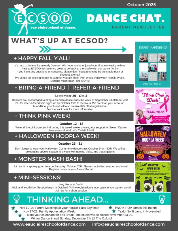 The latest edition of our monthly newsletter, "ECSOD Dance Chat," is now available. Check it out below! Copies are also emailed out each month, and available at the studio.