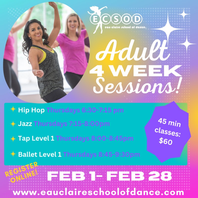 Eau Claire School of Dance is thrilled to offer a variety of Beginner/Intermediate level dance classes for students ages 18 and up! Though designed for fun and exercise, our adult dancers will also have the opportunity to perform in our spring recital if they wish to. Contact ECSOD for more information on our Adult Classes, or register now!
