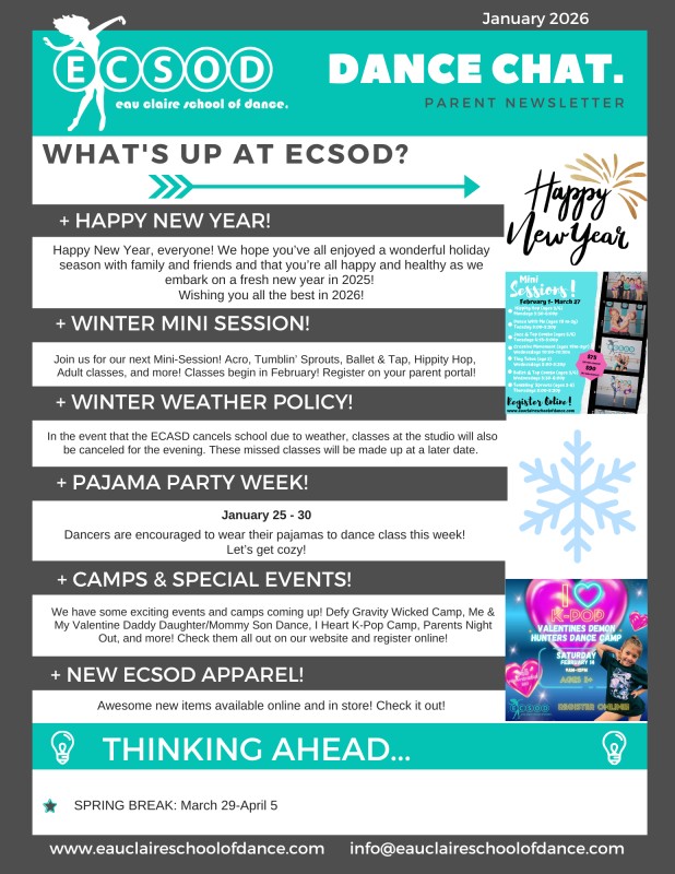 The latest edition of our monthly newsletter, "ECSOD Dance Chat," is now available. Check it out below! Copies are also emailed out each month, and available at the studio.